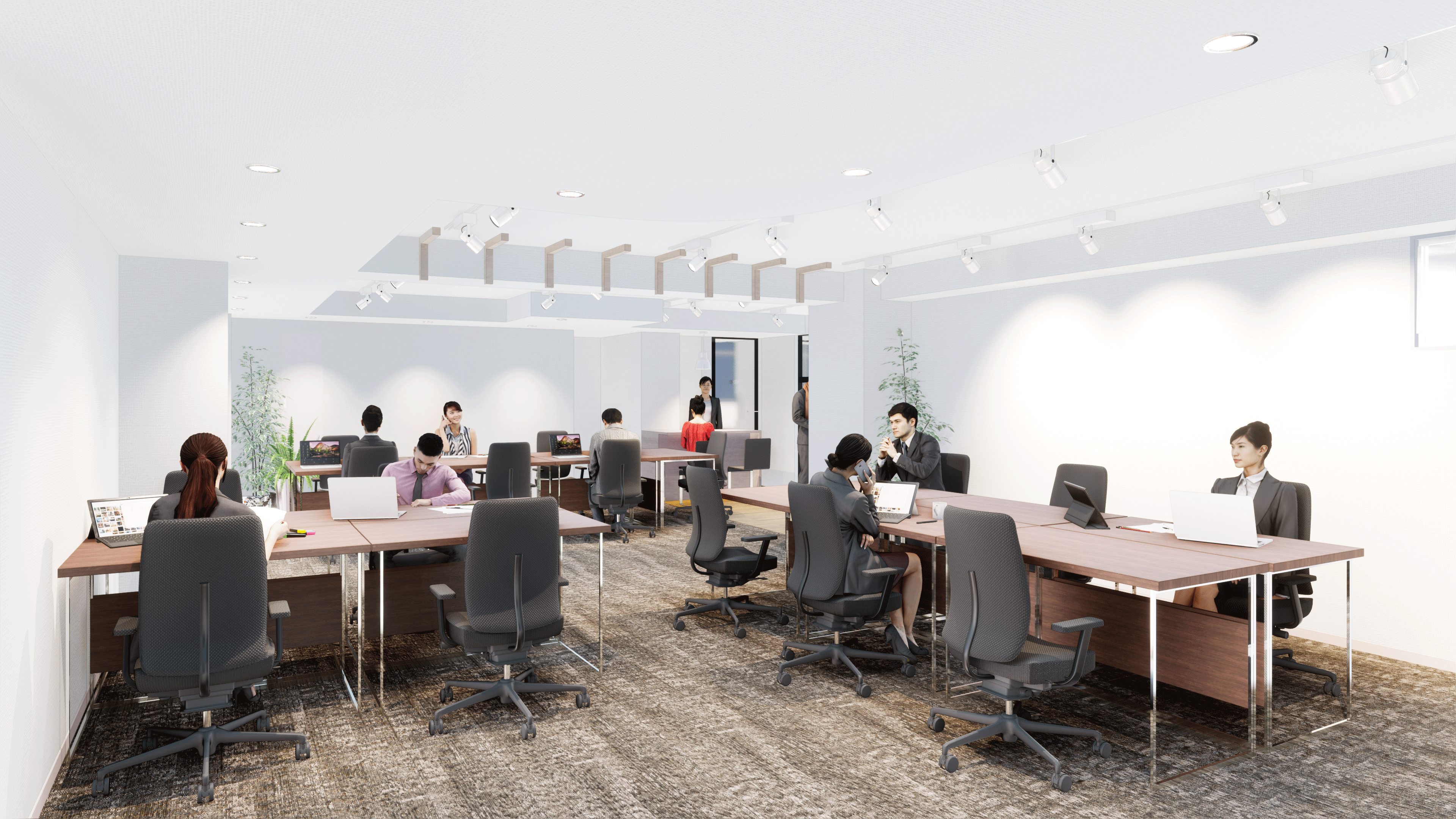 執務スペースは大きな窓から自然光が差し込む開放的な設計で、トラックライトによる効果的な照明が快適な作業環境を実現します。