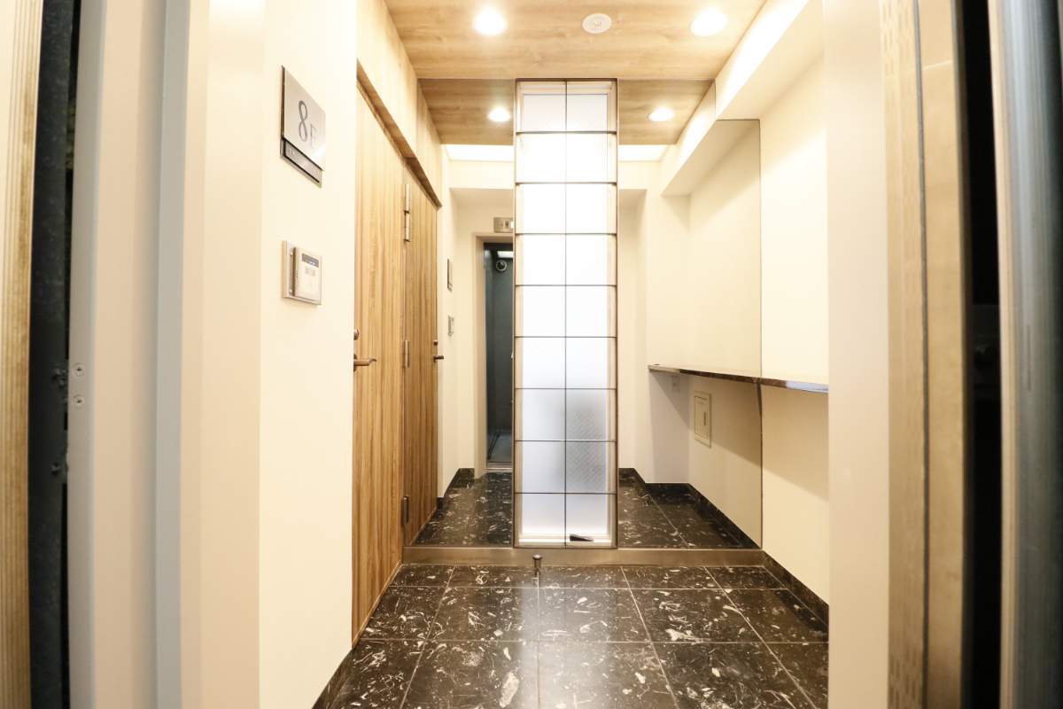エントランスは木目調の素材と大理石調タイルが調和した上質な空間で、来訪者に好印象を与えます。