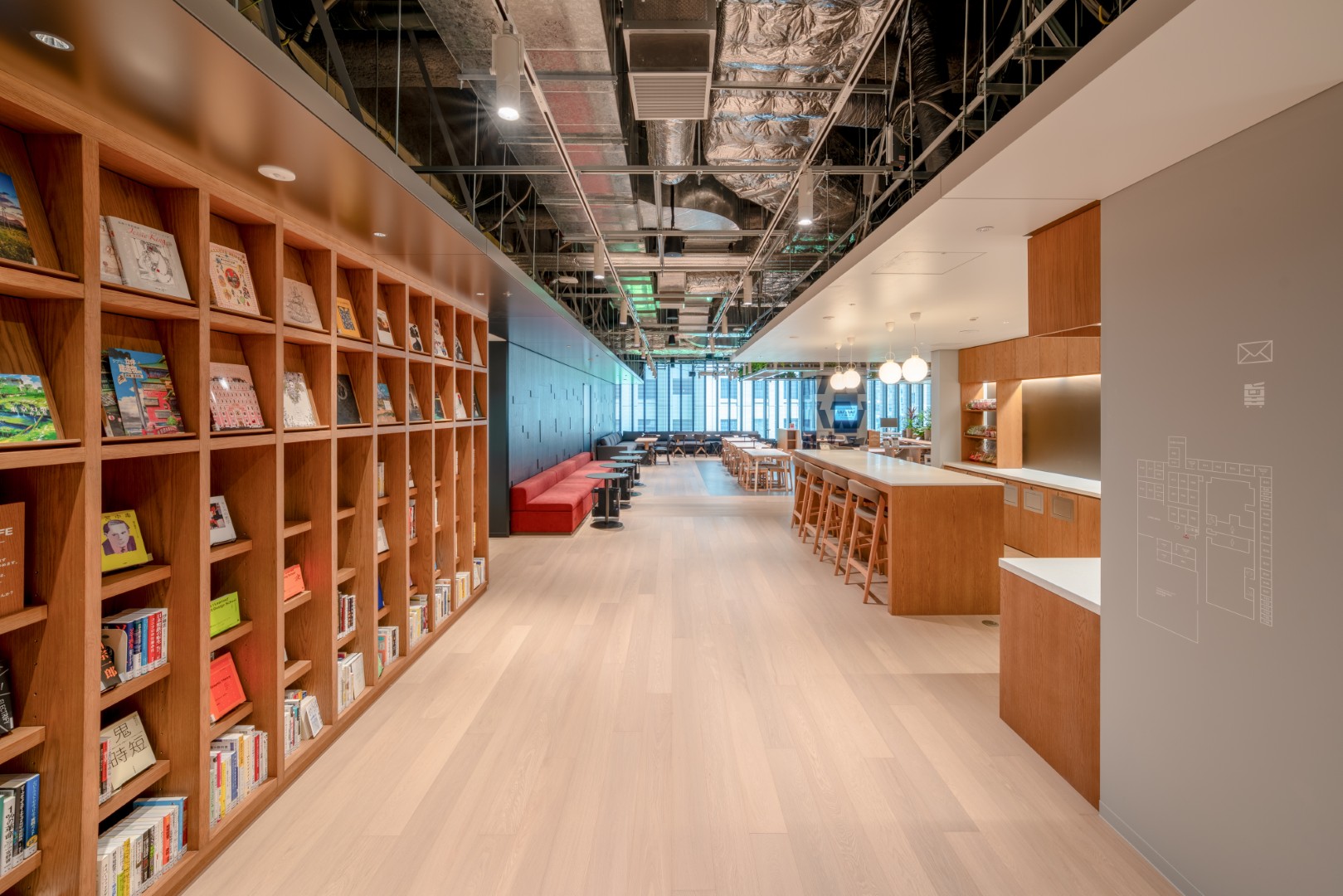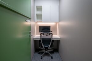 洗練されたエントランスと木質感のある温かみのあるインテリアが、プロフェッショナルな環境と居心地の良さを両立しています。内部には植物を配置したオープンエリアがあり、自然光とグリーンに囲まれた開放的な空間で集中力と創造性を高められます。また、高機能なオフィスチェアと昇降式デスクを全席に配備し、長時間の作業でも快適性を保てます。