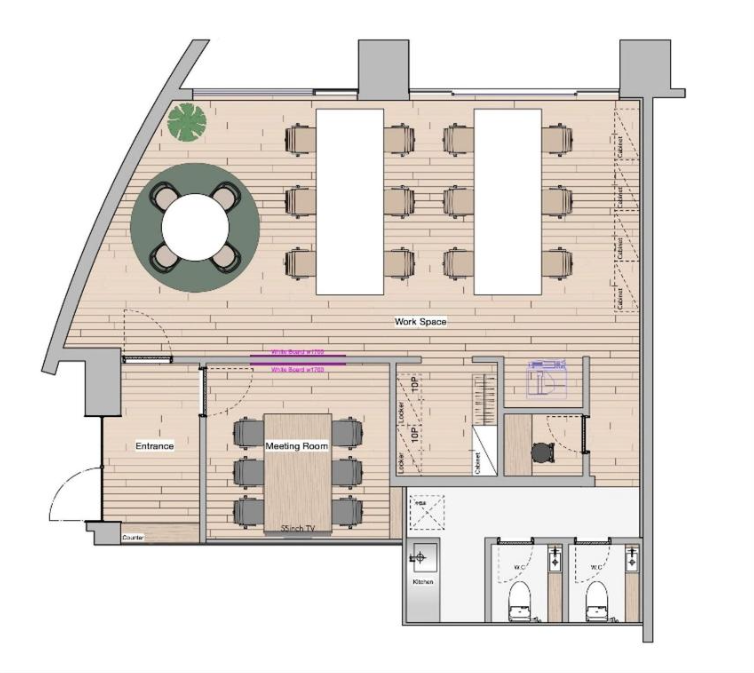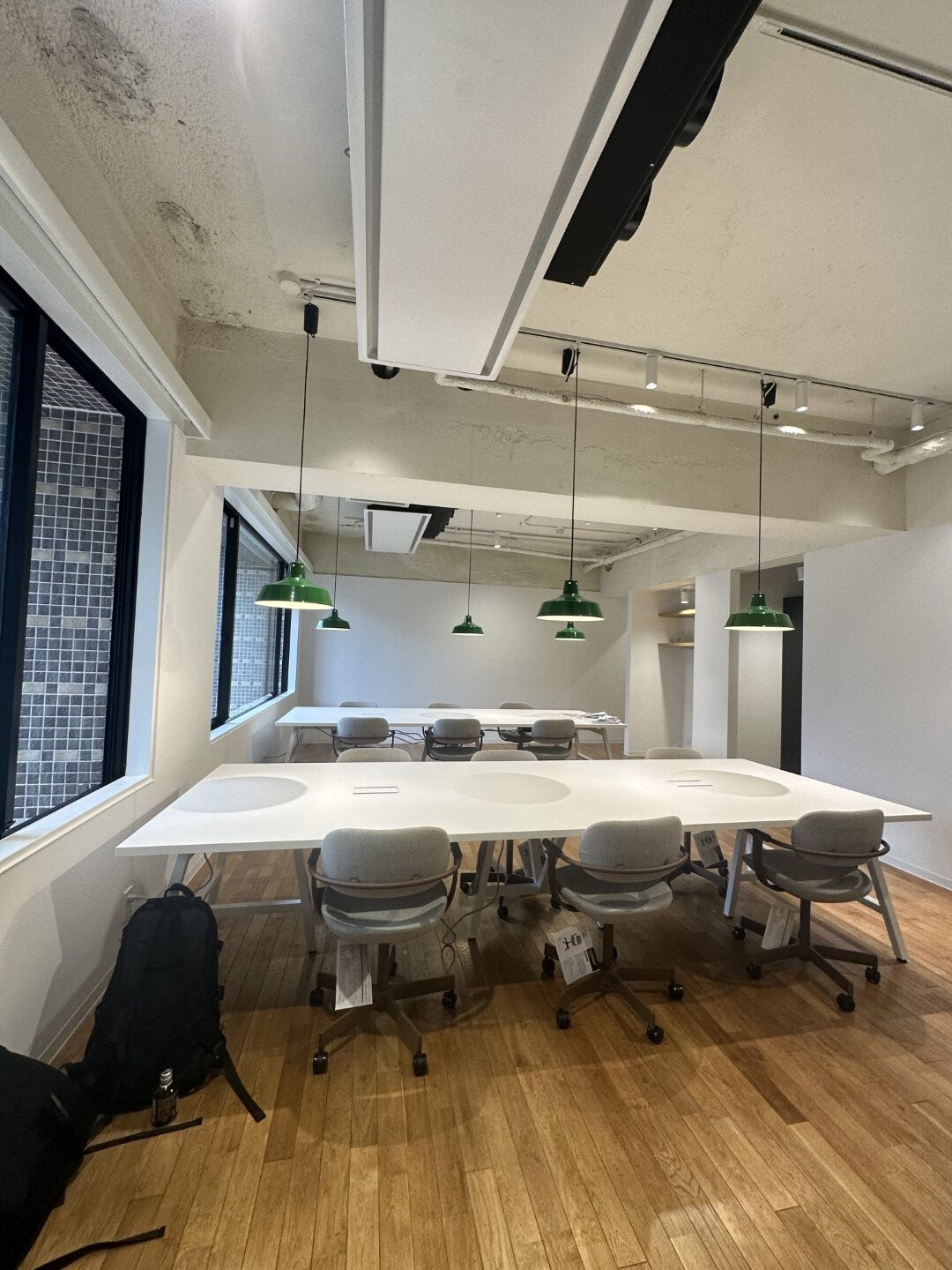 白を基調とした明るい空間に、木目調のフローリングと緑のペンダントライトが映える洗練されたデザインが特徴です。大規模リニューアルにより、現代的なワークスタイルに対応した快適な執務環境を実現しています。