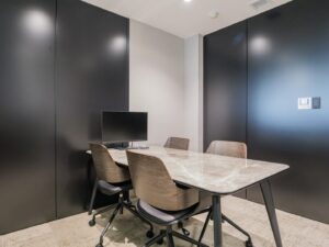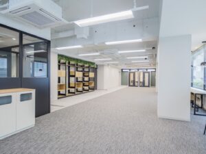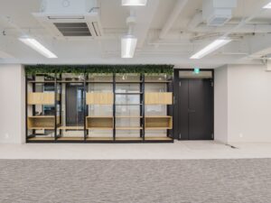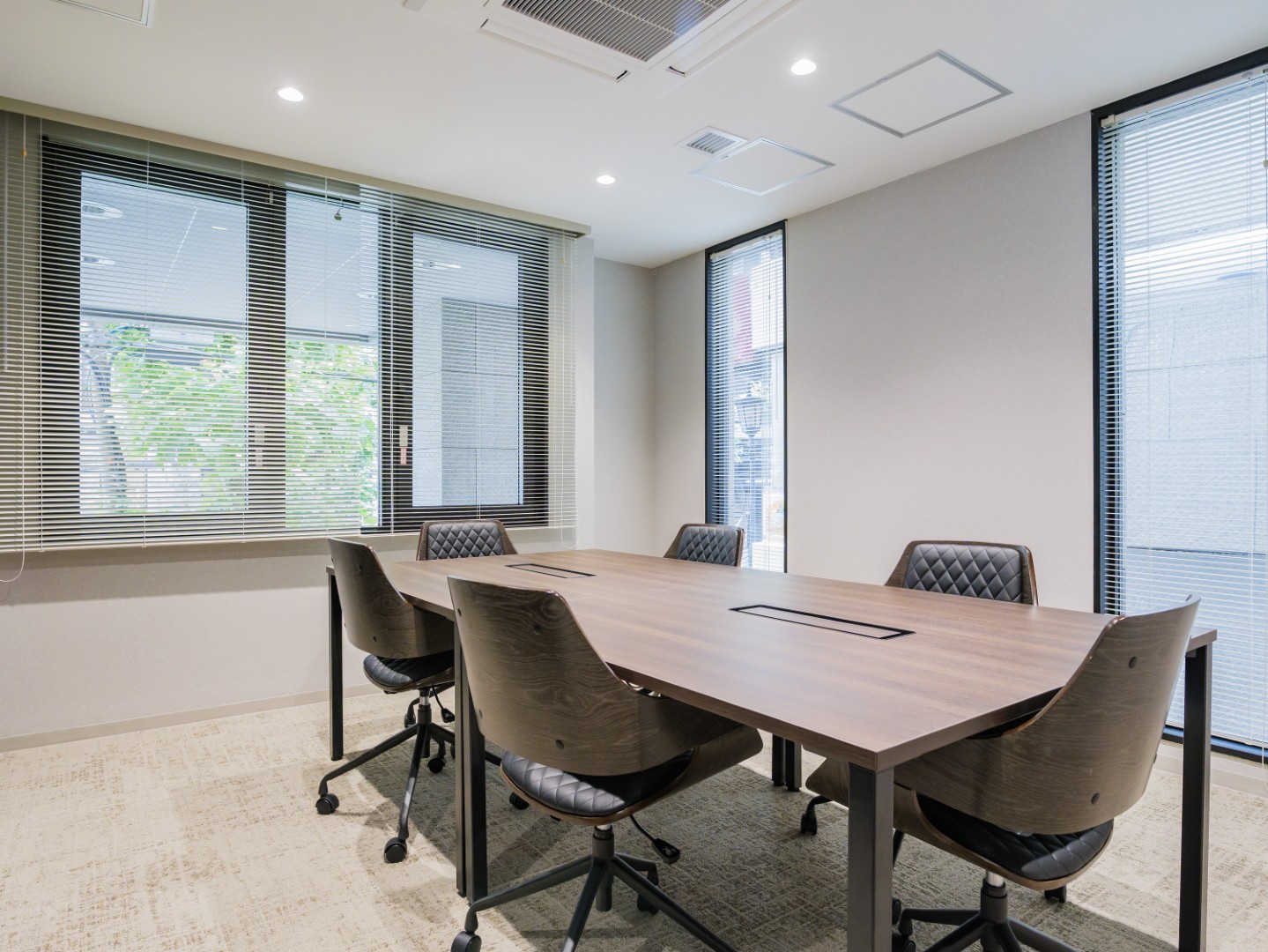 角地ならではの二面採光により、執務スペースには自然光がたっぷりと差し込み、開放的な雰囲気の中で業務に集中できます。複数のサイズの会議室に加え、オンライン商談に対応したウェブ会議専用スペースも設置されており、多様な打ち合わせスタイルに柔軟に対応可能です。