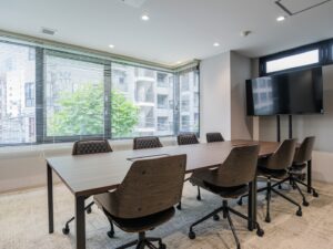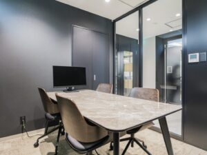 執務エリアにはデスクや什器があらかじめ設置されており、契約後すぐに業務をスタートできる点が大きな魅力です。大人数にも対応可能な会議室を備え、重要な商談やプレゼンテーションにも最適。