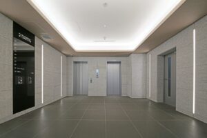 執務スペースは、広々とした設計により、ゆとりある作業環境を実現しています。フレキシブルなレイアウト対応により、企業の成長や組織変更に合わせた空間活用が可能です。エントランスホールは、モダンなデザインと上質な素材使いにより、来訪者に信頼感と安心感を与える空間となっています。セキュリティ面では、カードキーシステムによる入退室管理を採用し、情報管理の観点からも安心できる環境を整えています。