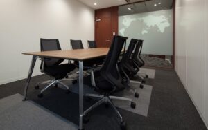 内装は既に整っており、執務スペースには複数のデスクと会議室が設置されています。白を基調とした明るい空間に、落ち着いたグレーのカーペットがアクセントとなり、集中力を高める環境が整っています。窓からの採光も十分で、自然光あふれる快適な執務環境を実現しています。