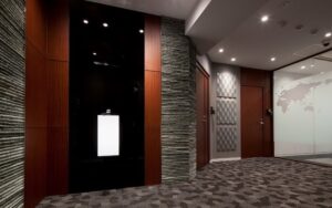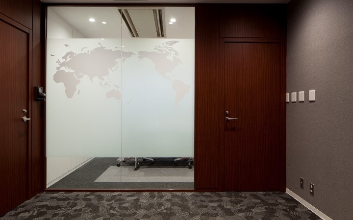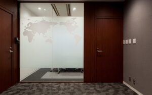 エントランスホールは高級感のある仕上げで、世界地図をモチーフにしたガラス張りの会議室など、グローバルな視点を持つ企業にふさわしい空間設計となっています。