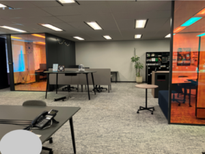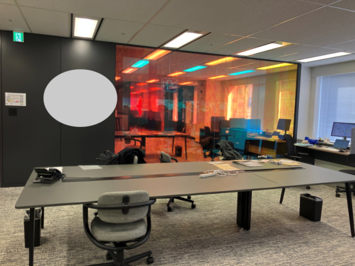 執務スペースには大型のカラーガラスパーティションが設置され、開放感を保ちながらも適度なゾーニングが実現されています。