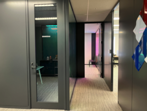 エントランスを入ると、壁面を彩るカラフルなアートパネルが来訪者を出迎え、企業のクリエイティブな姿勢を印象づけます。