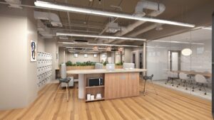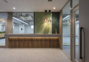 当オフィスは、木目調のアクセントが映える受付カウンターが来訪者を温かく迎え、企業の第一印象を格上げします。