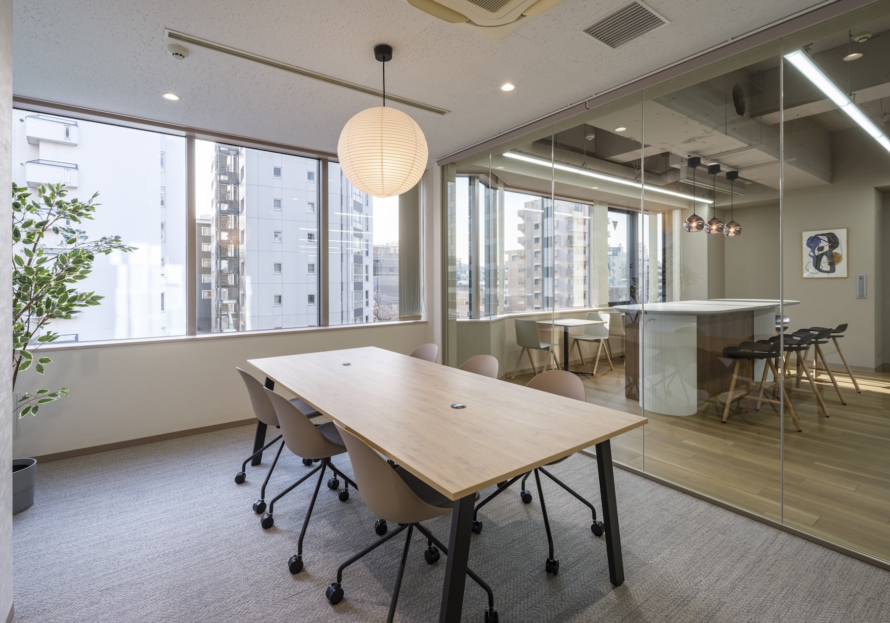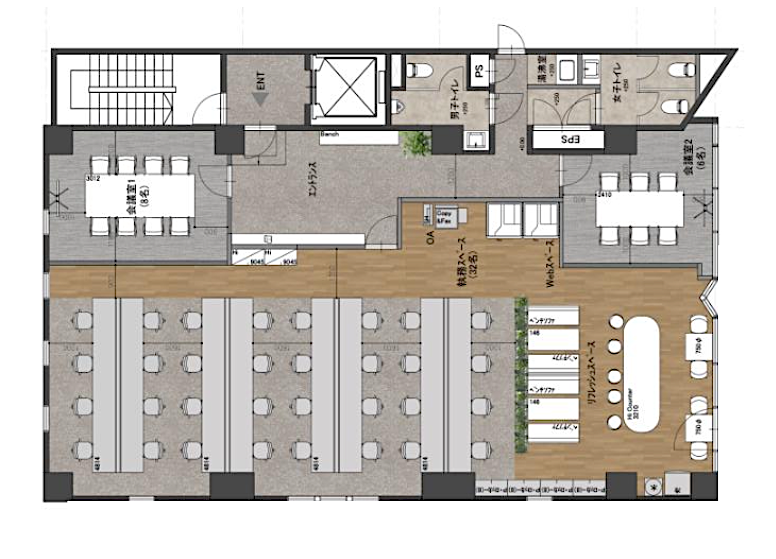 執務エリアは効率的なレイアウトで、窓面側のラウンジスペースでは従業員同士の交流やリフレッシュが可能です。2つの会議室は用途に応じて使い分けができ、商談から社内ミーティングまで幅広く活用できます。