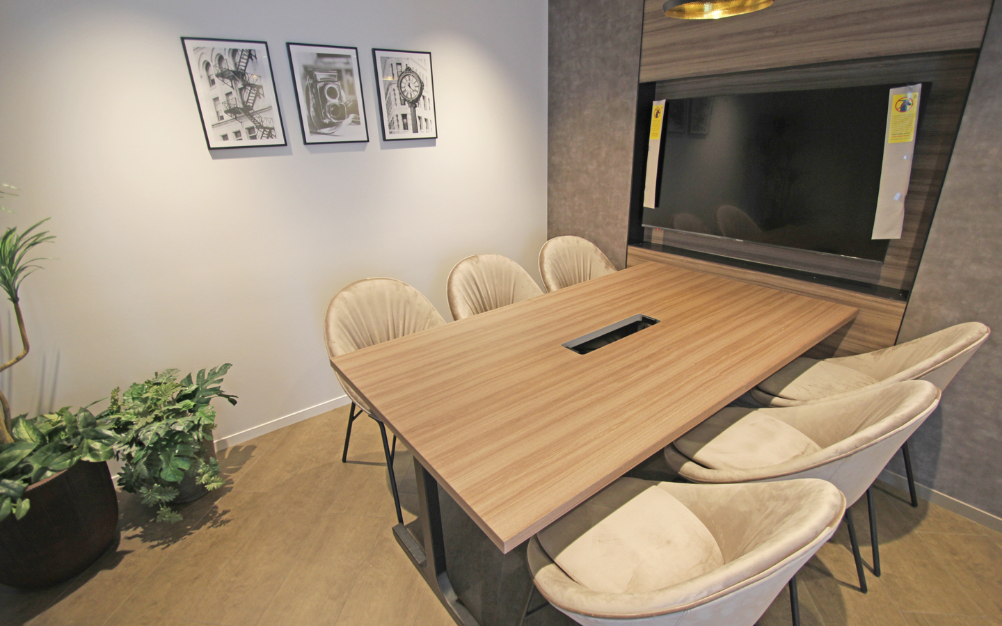 大型モニターを備えた会議室は、木目調のテーブルとベージュのチェアで統一され、落ち着いた雰囲気の中でのプレゼンテーションや商談に最適です。