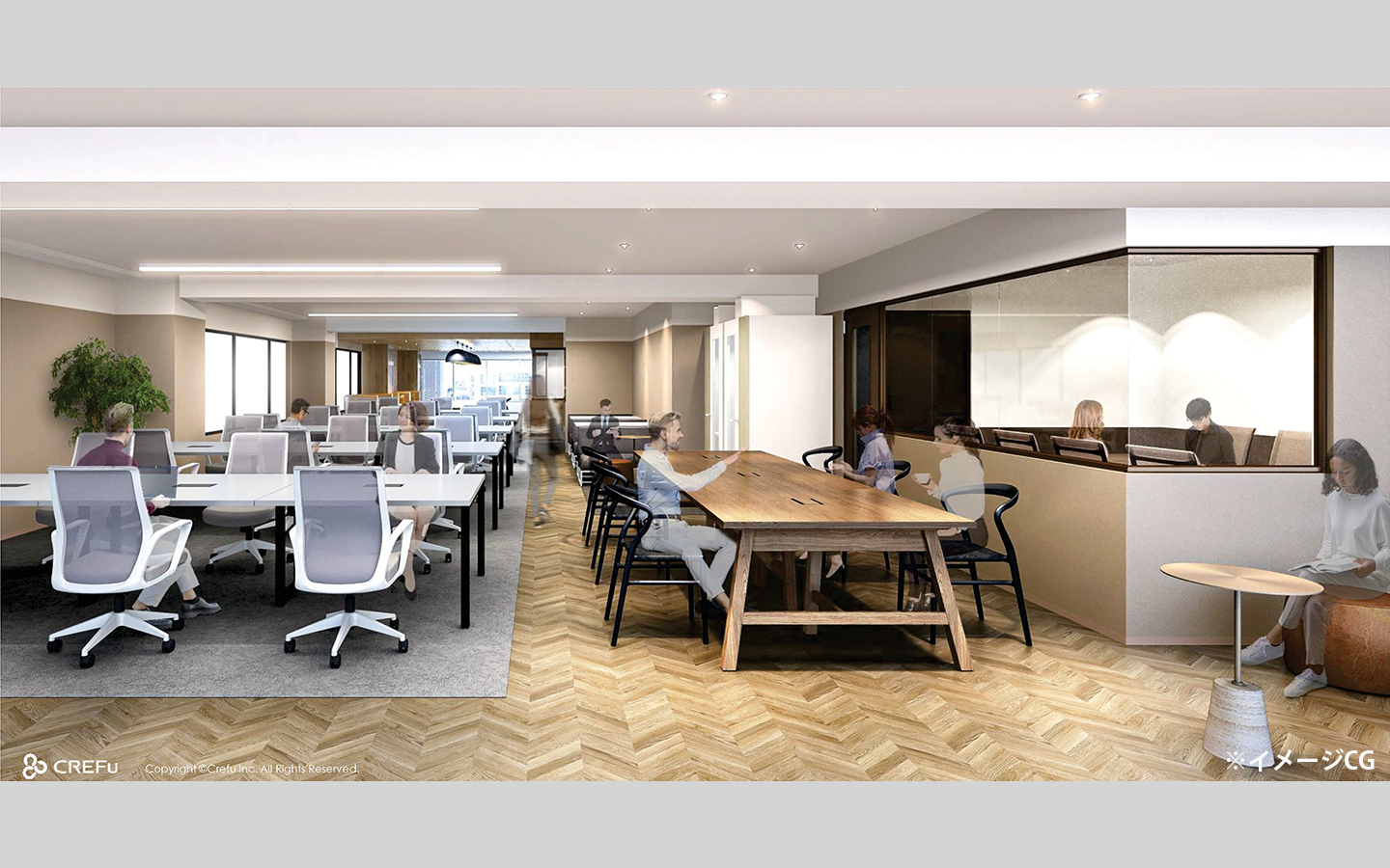 本フロアは、2つの会議室と2台のフォンブースを備えた、機能性の高いレイアウトが特徴です。内装は素材感にこだわったスタイリッシュなデザインで、来訪者に先進的かつ信頼感のある印象を与えます。