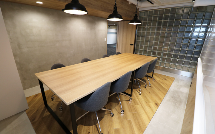 会議室や個室スペースを備えた機能性と、ガラスブロックやスポットライト照明による美しいデザイン性が共存する空間は、ビジネスの可能性を広げます。