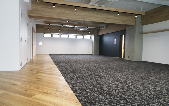 内装は木目調の天井デザインと打ちっぱなしコンクリート、レンガ調の壁が絶妙に調和し、トレンド感と落ち着きを併せ持つ空間を実現しています。メインスペースはカーペットとフローリングが組み合わされた広々とした空間で、用途に応じた柔軟なレイアウトが可能です。