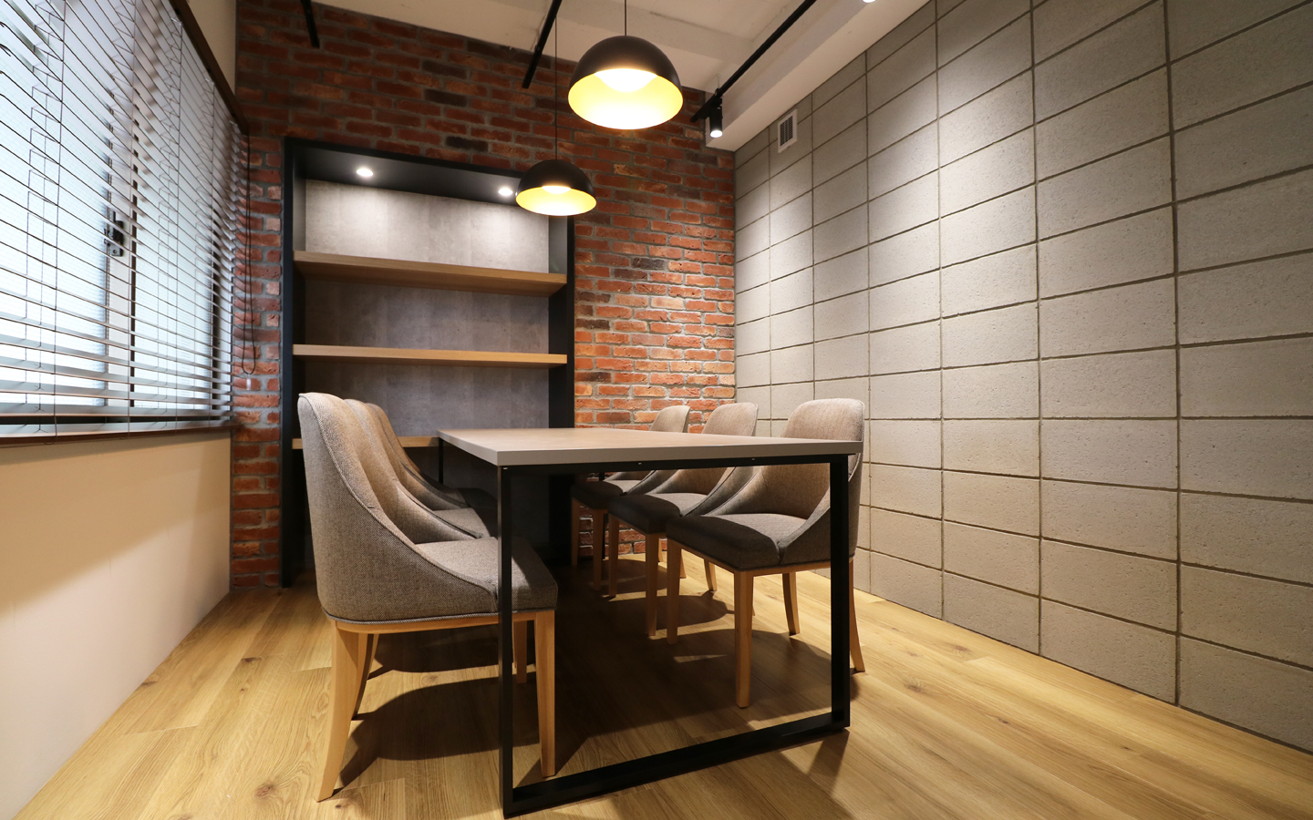 スポットライト照明が空間全体に洗練された雰囲気をもたらし、クリエイティブな発想を促します。ガラスブロックのパーティションは採光性を確保しながら空間に奥行きを与え、開放感と適度なプライバシーを両立しています。会議室はペンダントライトとガラスブロックが特徴的で、重要な商談やミーティングに相応しい格調高い空間です。個室スペースはレンガ調の壁と吸音パネルを配した集中作業に最適な環境となっています。