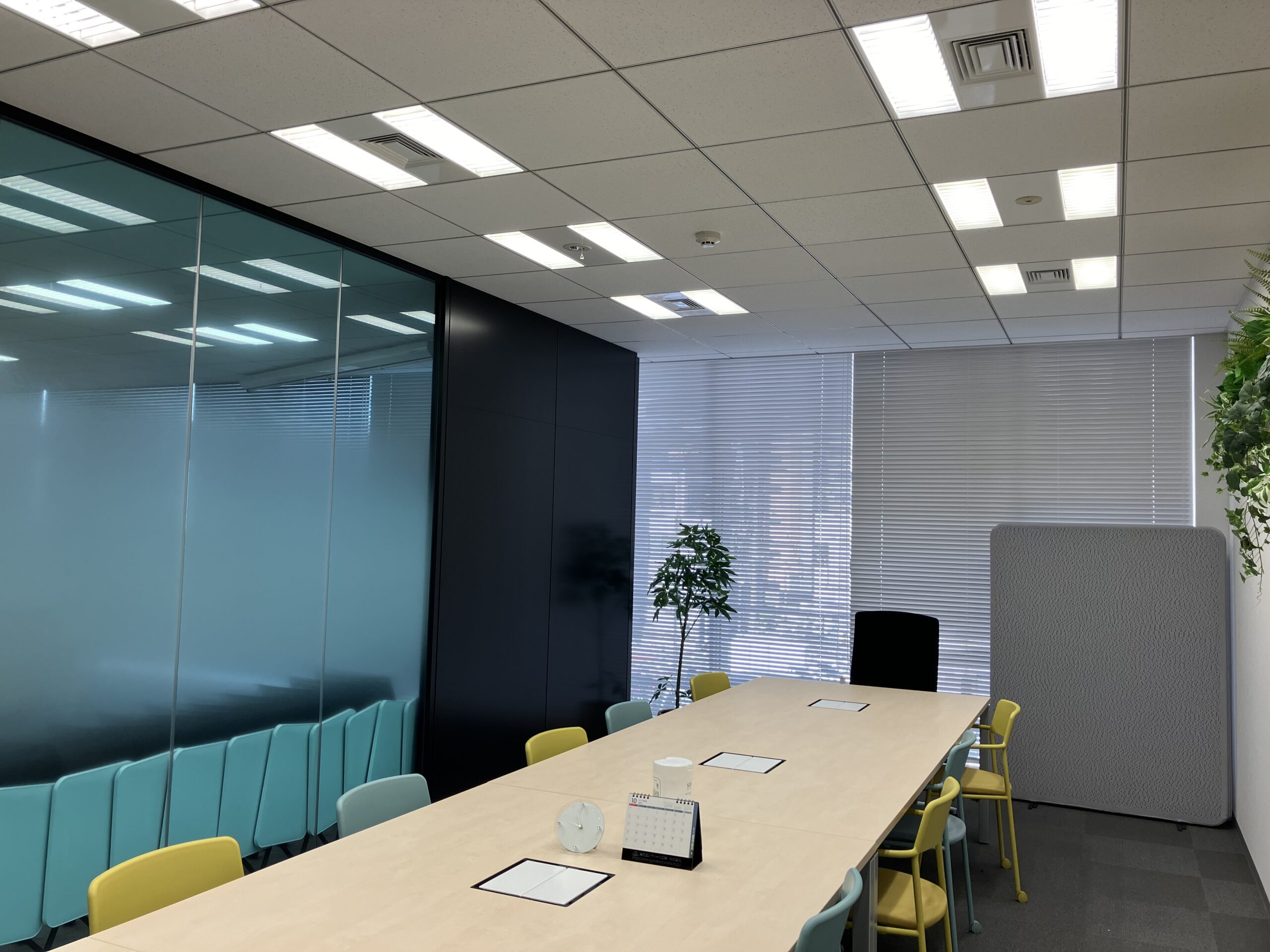 壁面グリーンが彩るナチュラルな内装と、カラフルなチェアが配された会議室が、来訪者に洗練された印象を与えます。詳細は以下をご覧ください。